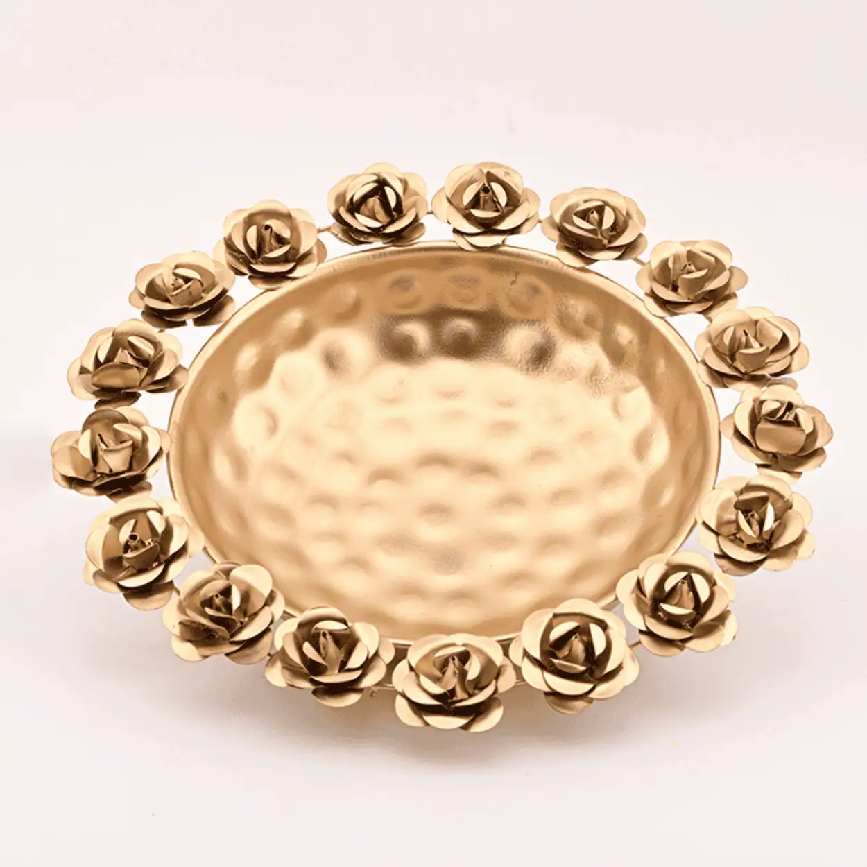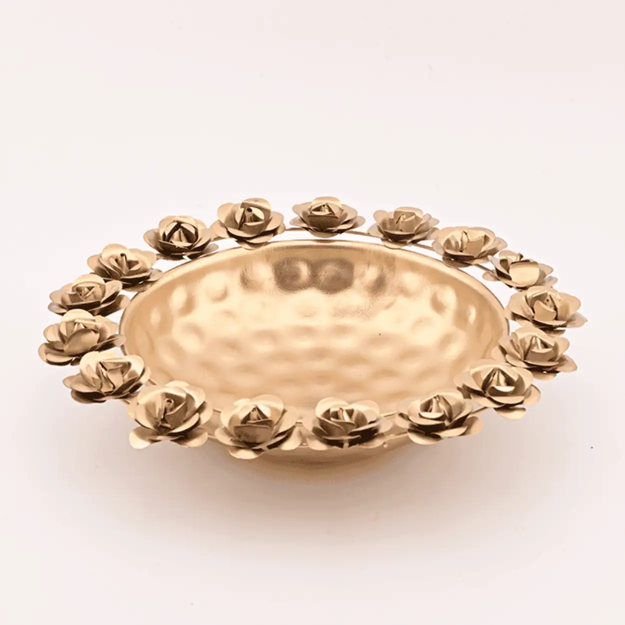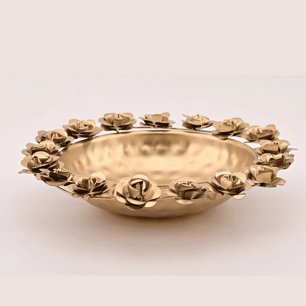 Each flower is carefully moulded and polished to perfection, creating a play of light and shadow that enhances its visual depth. The golden tone makes it an ideal choice for festive occasions — whether filled with floating candles, rose petals, or aromatic potpourri.